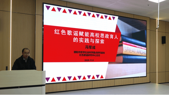 11月6日上午,由優(yōu)秀傳統(tǒng)文化教育與傳承工作室承辦的“紅色歌謠賦能高校思政育人的實(shí)踐與探索”主題沙龍講座在雙創(chuàng)大樓B309智慧黨建中心舉行。本次講座特邀德陽(yáng)市哲學(xué)社會(huì)科學(xué)重點(diǎn)研究基地紅色歌謠研究中心主任馮軍成擔(dān)任主講,本次講座由輔導(dǎo)員李飛主持。學(xué)校輔導(dǎo)員、外語(yǔ)院青馬班學(xué)員等50余人參與,共同探討紅色歌謠融入思政育人的路徑與案例。
