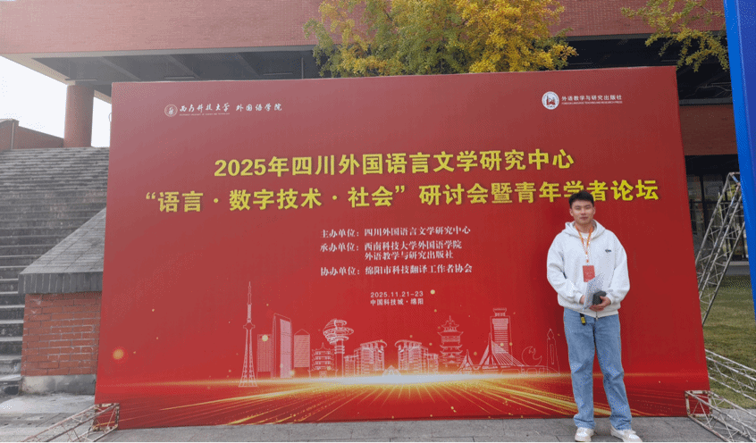 2025年11月21日至23日, 2025 年“語言·數字技術·社會”研討會暨青年學者論壇在四川省綿陽市隆重舉行。本次研討會暨青年論壇由四川省教育廳哲學社會科學重點研究基地、四川外國語言文學研究中心主辦,西南科技大學外國語學院和外語教學與研究出版社共同承辦,綿陽市科技翻譯工作者協會協辦,吸引了來自荷蘭格羅林根大學、新加坡南洋理工大學、西班牙華文軒中文學校、香港理工大學、四川大學、成都理工大學、西南石油大學、成都信息工程大學、西安交通大學、上海外國語大學、天水師范大學等國內外 20 余所高校的 140 位專家學者、青年科研人員參會,取得了豐碩的學術交流成果。我院外國語言學及應用語言學專業2024級碩士研究生楊佳樂在導師高黎副教授的指導下受邀參會,并在分論壇上宣讀論文,表現優異。