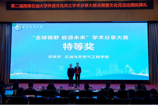 作為本次外語文化月的主題活動,“全球視野 能源未來”學術分享大賽由各學院組織初選,最終來自10個學院的10名參賽者進入復賽。6日晚,活動現場進行了學術分享大賽決賽,6位選手采用英文通過分享展示和即興問答兩個環節展開激烈角逐。他們圍繞能源議題從不同角度深入思考解讀,充分展現了扎實的學術基礎、優秀的跨文化交際能力和對“能源報國”理念的深刻理解。最終,來自石工院的邱榮歡獲得特等獎。