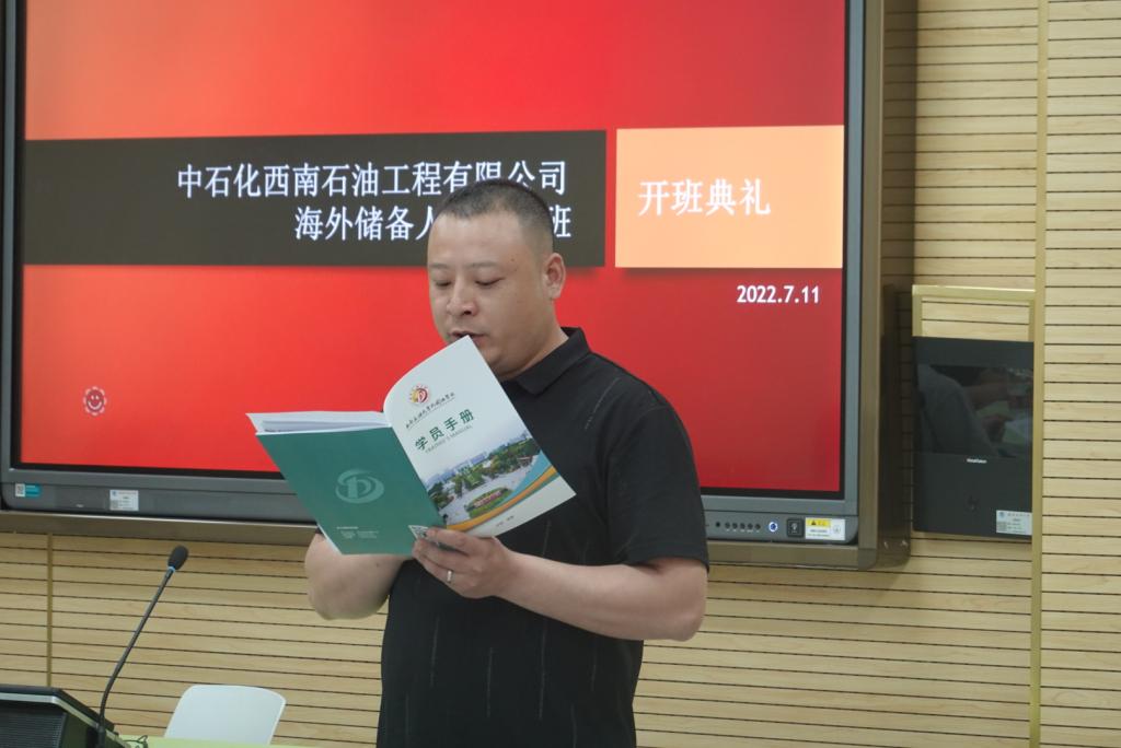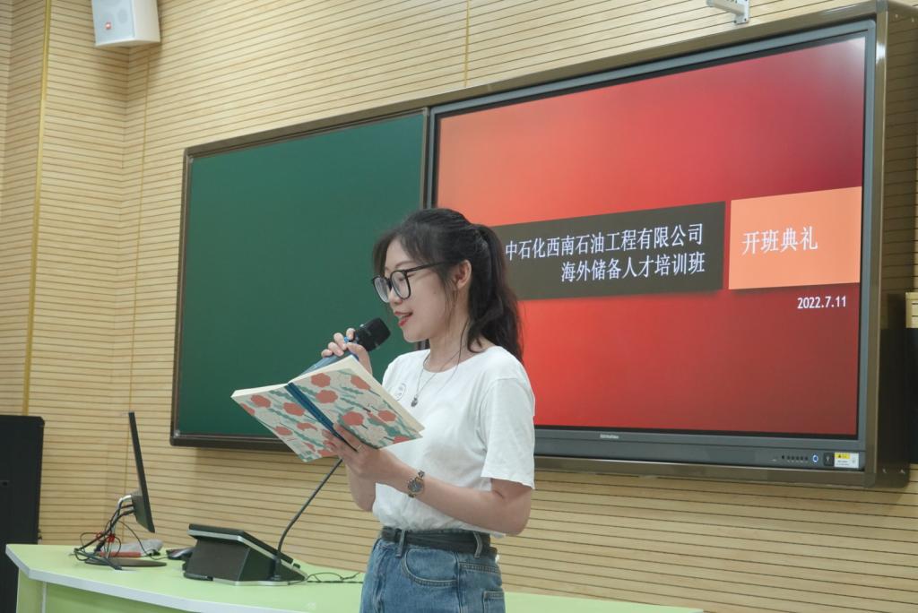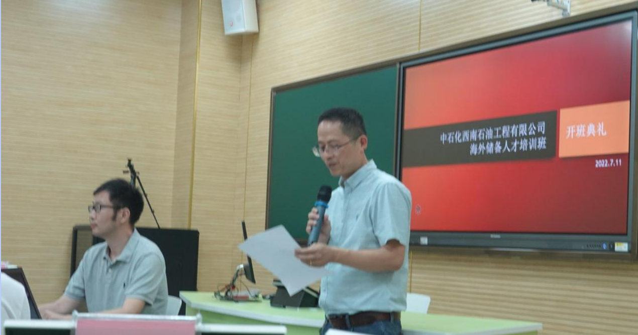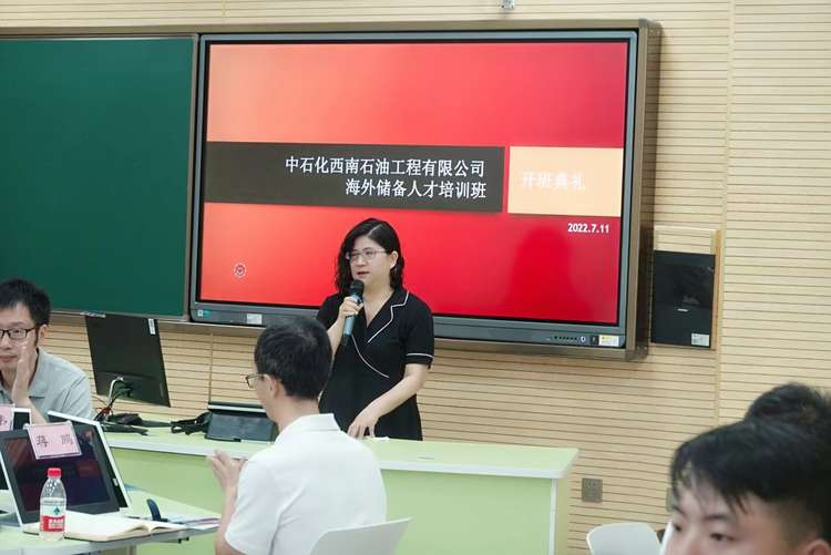 2022年7月11日上午9點,中石化西南石油工程有限公司海外儲備人才培訓(xùn)開班典禮在思學(xué)樓b107成功舉行。出席本次會議的有西南石油工程公司人力資源部副部長衛(wèi)瑋,國外工程管理中心外事專家蔣鵬,高級主管向紅兵,主管王百峰,科威特項目夜班隊長陳森;西南石油大學(xué)外國語學(xué)院黨委書記姚明淑,辦公室主任兼培訓(xùn)班班主任劉鈺,國際培訓(xùn)部主任嚴(yán)仁杰,副主任羅藝文;授課教師王娜、徐繼菊、安超、廖敏芳、郭文英;助教同學(xué)們和全體學(xué)員。