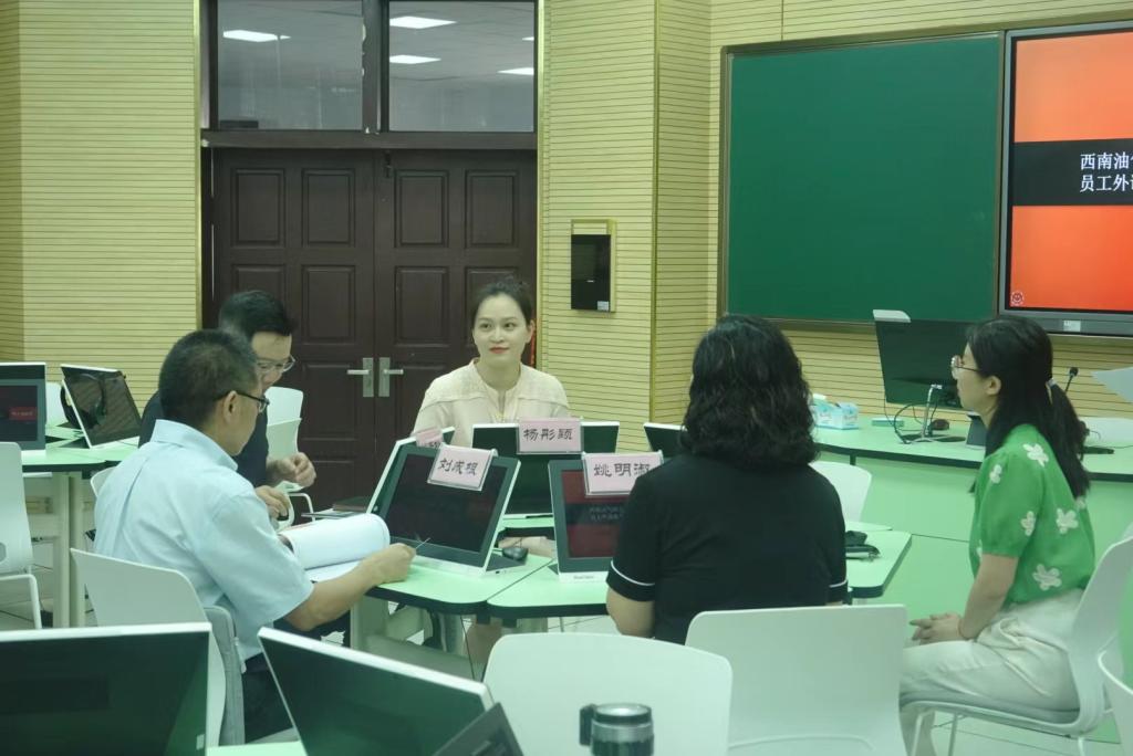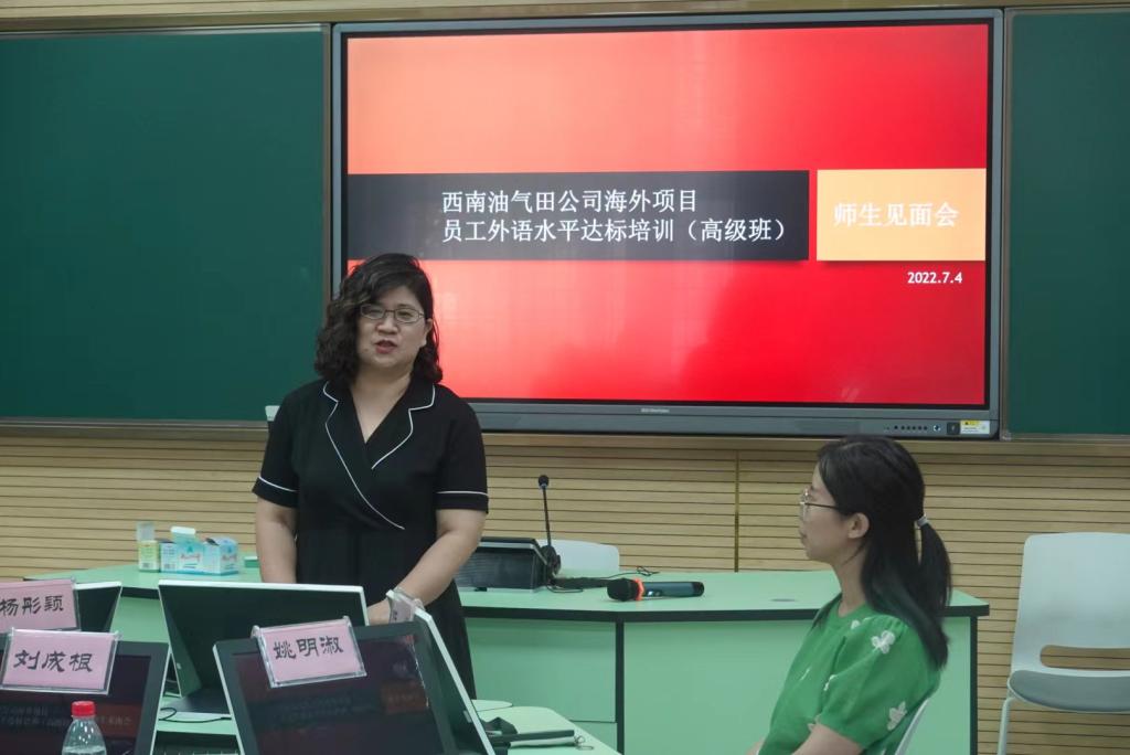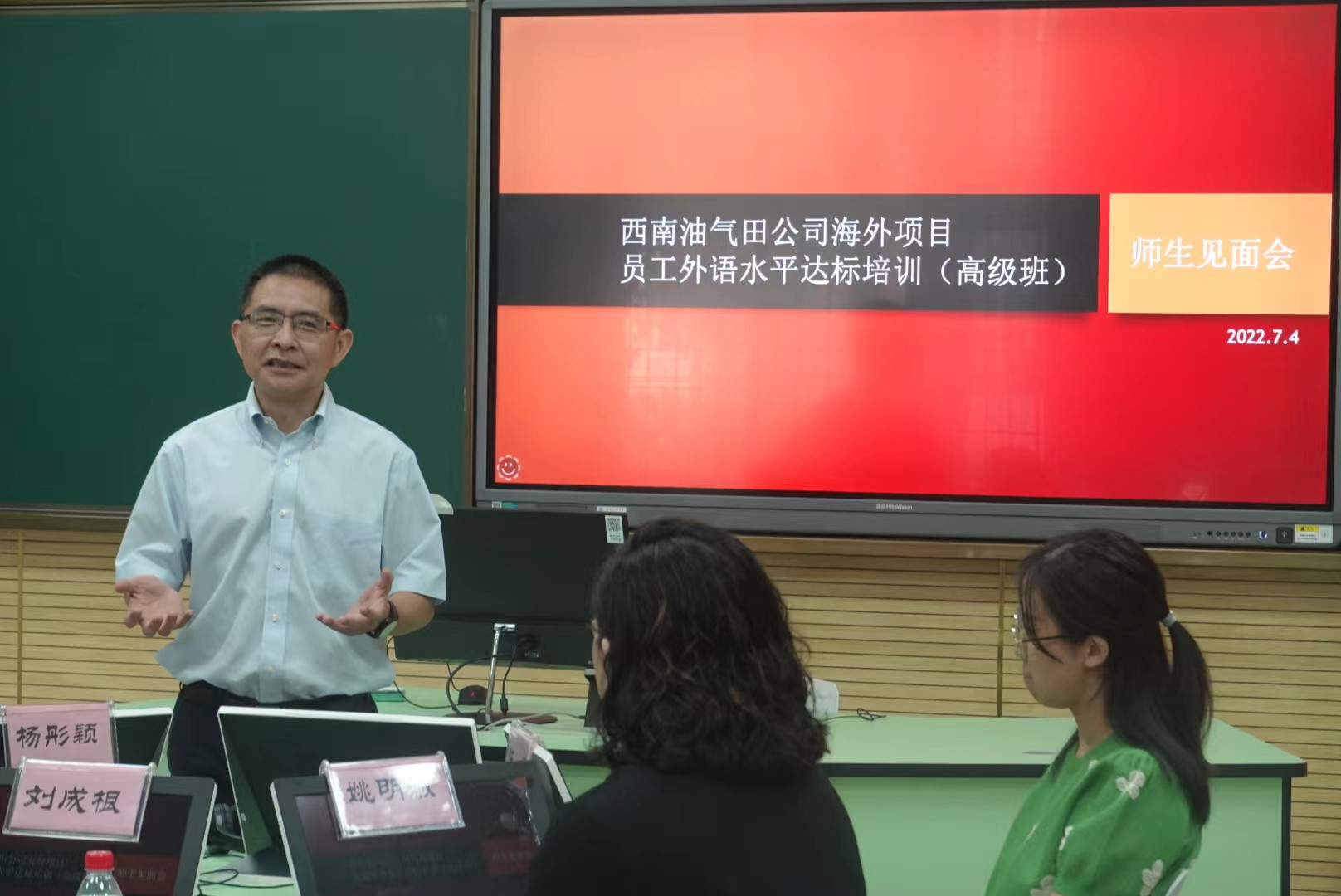 2022年7月4日早上8點30分,西南油氣田公司海外項目員工外語水平達標培訓(高級班)師生見面會在思學樓B106順利舉行。出席本次見面會的有西南油氣田公司對外合作部主任劉成根、副主任曾青松、外事管理科科長楊彤穎,西南石油大學外國語學院黨委書記姚明淑、副院長陳婧,院長助理肖燕姣,辦公室主任(兼班主任)劉鈺,實驗室主任陳波,國際培訓部主任嚴仁杰,副主任王焰妮、 羅藝文,任課教師王蕾、劉秦君、 劉祥瑞,學生助教王晶以及培訓班全體學員。