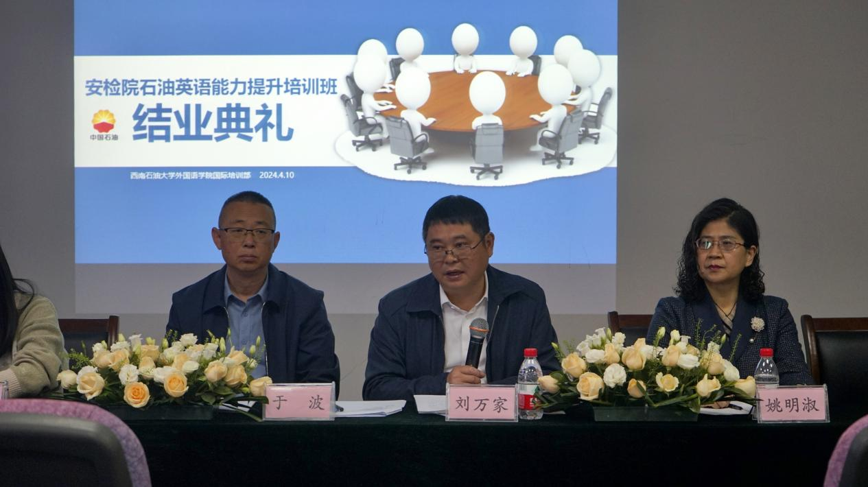 典禮上,劉萬家首先表達了對西南石油大學外國語學院的感謝,劉書記談到,從匯報演出中看到了學員們學以致用的精神,并將所學的英語知識與實踐相結合,展現了出色的英語水平和應用能力。劉書記相信,通過此次培訓,大家的英語水平都得到了顯著的提高。劉書記對培訓學員提出了三點要求:第一,加強學習,推動中堅力量。我們要著力培養國際化復合型人才、實現高質量發展、拓展國際事業。每一位學員都要繼續深化學習,不斷提升自己的綜合素質,運用所學知識為公司的國際化發展貢獻力量。第二,學以致用,再上新臺階。目前,公司國際業務發展情況不錯,但仍有很大的提升空間。希望大家能夠乘勢而上,抓住機遇,將英語與工作緊密結合,積極投入到海外市場中去,在工作中實現人生價值,推動國際業務的高質量發展。第三,弘揚奮斗精神,堅持奮斗。我們要時刻牢記黨的使命,堅持初心,不斷增強凝聚力和戰斗力。只有不斷奮斗,我們才能加快建設世界一流石油行業的步伐,為實現中華民族偉大復興的中國夢貢獻力量。最后,劉書記再次向外國語學院表示衷心的感謝,并祝愿外語學院明天更加輝煌!同時,也祝愿各位學員在未來的工作和生活中取得更加輝煌的成就。