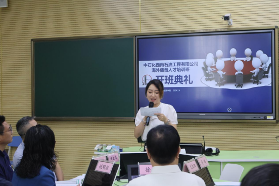 7月4日上午,中石化西南石油工程有限公司海外儲備人才培訓班開班典禮在思學樓B107舉行。出席本次開班典禮的有西南石油工程公司副總經理徐泓、國外工程管理中心經理許家國、湖南鉆井分公司經理文紅陽、國外工程管理中心專家蔣鵬、湖南鉆井分公司人力資源部主任田紅軍,西南石油大學外國語學院黨委書記姚明淑、國際培訓部主任嚴仁杰、學院辦公室主任(兼培訓班班主任)劉鈺、語言實驗與教學輔助中心主任唐敏、國際培訓部副主任羅藝文以及全體教師。