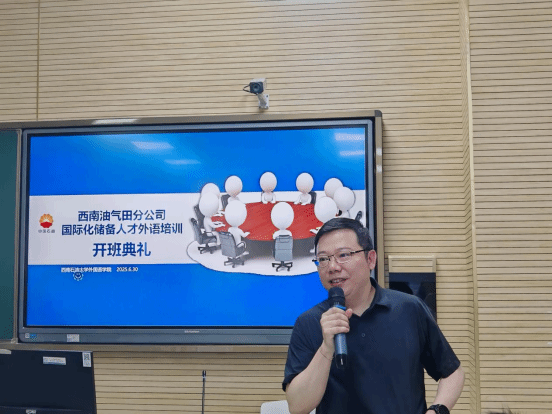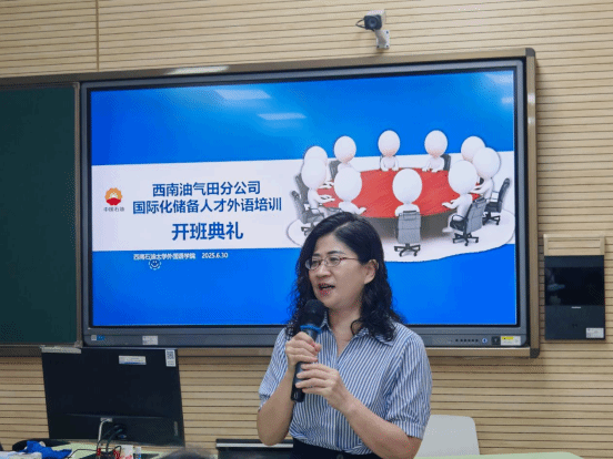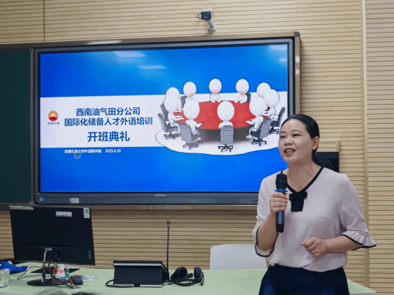 儀式上,西南石油大學外國語學院黨委書記姚明淑講了話。她對西南油氣田公司領導及學員的到來表示了最熱烈的歡迎。她指出,本次培訓是服務集團公司國際化戰略的重要舉措。自今年4月起,學院精心籌備,嚴格選拔師資團隊,組織集體磨課與教案檢查,確保教學質量,為培養國際化人才提供有力保障。培訓課程也將緊扣集團公司核心需求,以考核達標為導向,優化教學內容,確保每一堂課都能讓學員學有所獲、學有所進。她希望全體學員珍惜學習機會,高效利用時間,以積極的態度投入培訓。同時,學院管理團隊將全力做好教學支持與后勤保障,為學員創造良好的學習環境。最后,她勉勵大家勤奮學習、提升能力,順利達成培訓目標,為集團公司國際化發展貢獻力量。