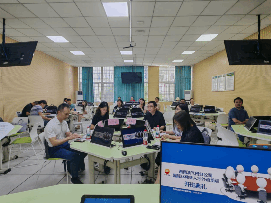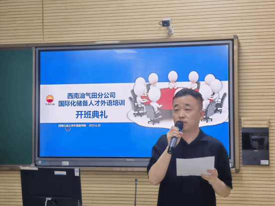 6月30日上午,西南油氣田公司國際化儲備人才外語培訓班開班典禮在思學樓B107舉行。出席本次開班典禮的有西南油氣田公司對外合作部主任曾青松、對外合作部外事管理一級高級主管楊彤穎、對外合作部外事管理二級高級主管梁寶輝,西南石油大學外國語學院黨委書記姚明淑、外國語學院院長呂旭英、國際培訓部主任嚴仁杰、國際培訓部副主任羅藝文、國際培訓部助理(兼班主任)李儀凡、助教楊博雅、任課教師劉佯、劉秦君以及全體參訓學員。