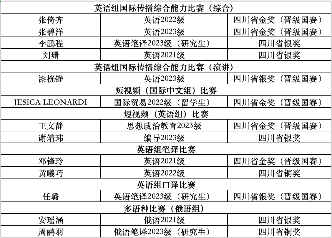 11月3日,由四川省教育廳主辦的四川省“外研社·國才杯”“理解當代中國”全國大學生外語能力大賽決賽在成都師范學院舉行,我校學生獲金獎5項、銀獎6項、銅獎2項。