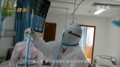 在武漢市第四醫(yī)院,多位黨員把紅星畫在防護服上,旁邊還寫著“有事找黨員”,讓防護服成為一道令人安心的風(fēng)景線。