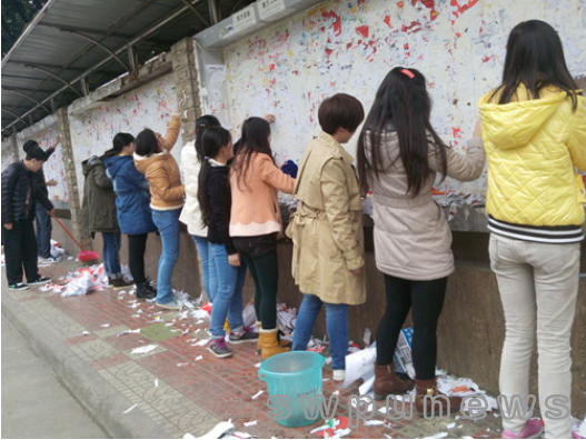 當天中午,化工院團委學生會的60余位青年志愿者們分成多個小組,分別對博學廣場兩側的廣告欄、一食堂張貼欄的垃圾廣告進行了清理。在清理活動過程中,志愿者們都認認真真、干凈利索地撕下每一張“牛皮癬”,再用濕布或鐵鏟清理著殘留的碎屑,一起為創造一個干凈、和諧、美麗的校園而努力著。通過廣大志愿者的分工合作,張貼欄煥然一新。