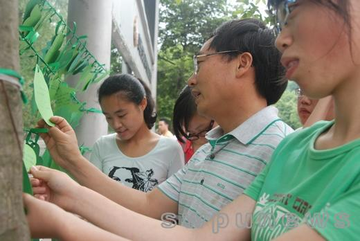 現場掛出的葉狀綠色小紙條上,設有多條與同學們切身相關的環保問答題,“夢溪河在給人以美的享受之外,還有怎樣的環保魅力?”同學們紛紛上前回答這些趣味問題,“可以積蓄雨水”、“還能澆灌綠地”……主辦方希望同學們在這些趣味的環保問答題中進一步了解環保,認知環保。