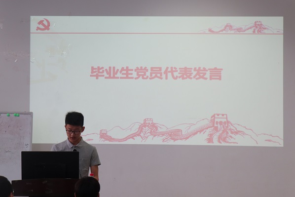 畢業生黨員文釗代表全體畢業生黨員發言,對學院辛勤工作、無私奉獻的領導和老師們表示深深的感謝和崇高的敬意,表示全體畢業生黨員在今后的學習工作中將以優秀共產黨員的標準嚴格要求自己,努力學習,扎實工作,爭取在未來的工作中取得更大的成績。