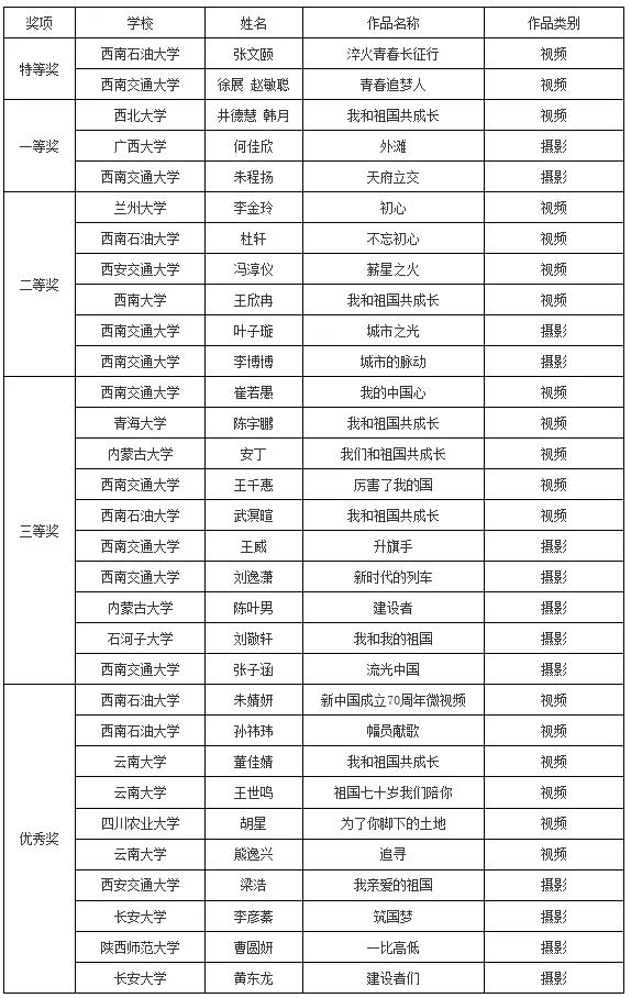本次大賽旨在深入學習貫徹習近平新時代中國特色社會主義思想,聚焦慶祝新中國成立70周年,充分激發新時代大學生的愛國熱情,廣泛凝聚新時代大學生的奮斗力量,堅定大學生的道路自信、理論自信、制度自信、文化自信,營造共慶祖國華誕、共享偉大榮光、共鑄復興偉業的濃厚氛圍。共收到來自西部27所“雙一流”高校的171份作品,經專家評審,共評出特等獎2名、一等獎3名、二等獎6名、三等獎10名、優秀獎10名,獲獎名單如下。