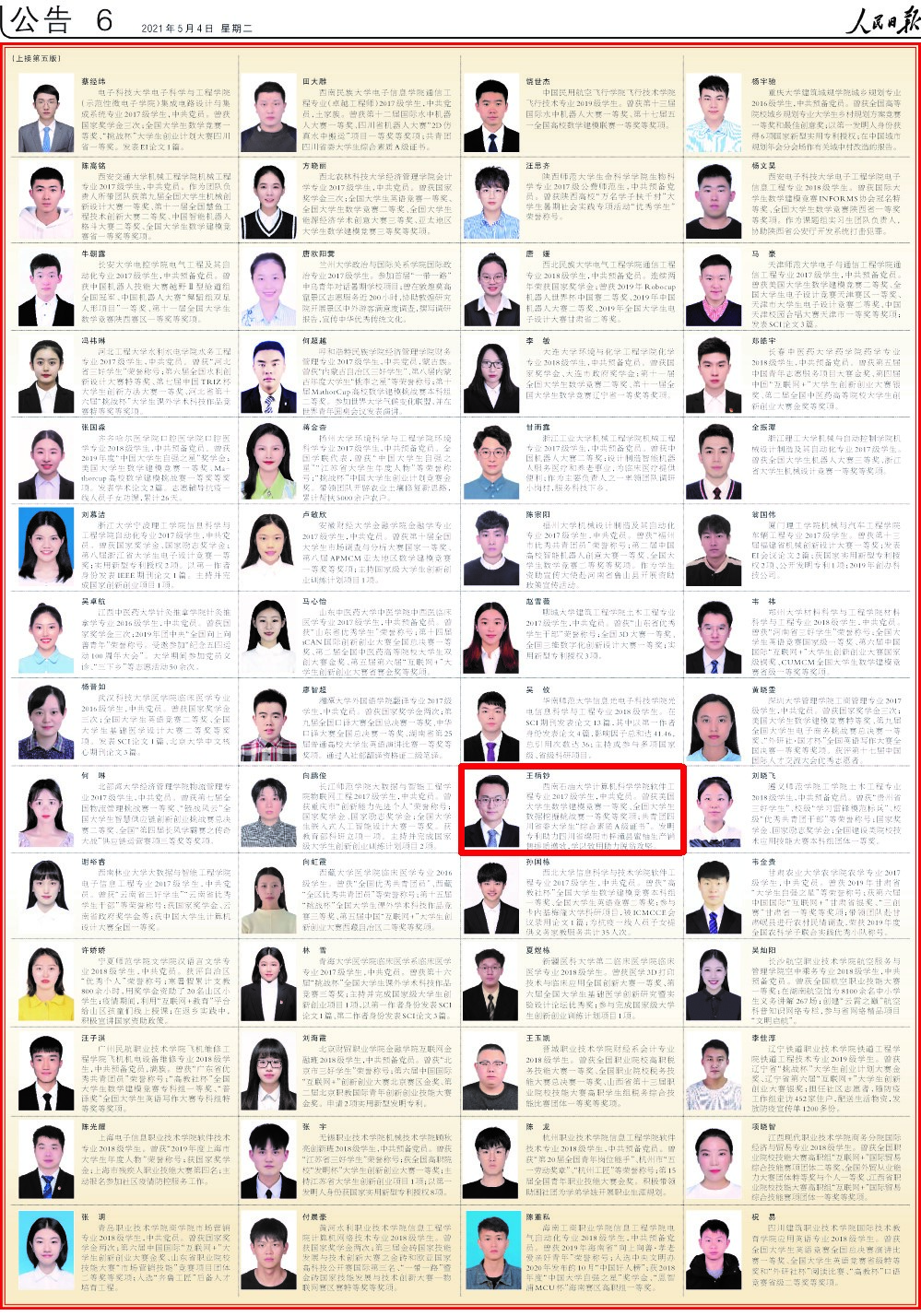 5月4日,《人民日報》刊發了《本科生國家獎學金獲獎學生代表名錄》,我校計算機科學學院軟件工程專業2017級王柄鈔同學入選。