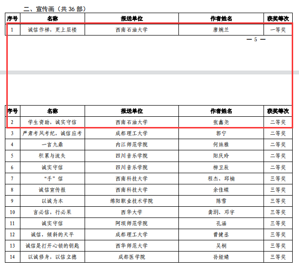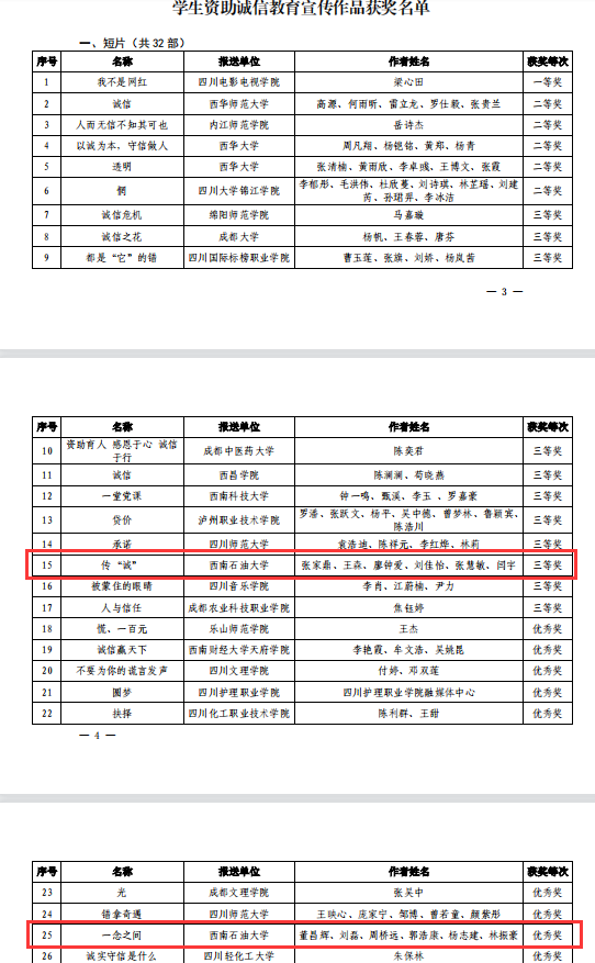 近日,四川省教育廳公布了2021年全省高校學生資助誠信教育宣傳作品評選結果,我校推薦報送4份作品分獲一、二、三等獎及優秀獎,學校連續五年獲評“優秀組織獎”。