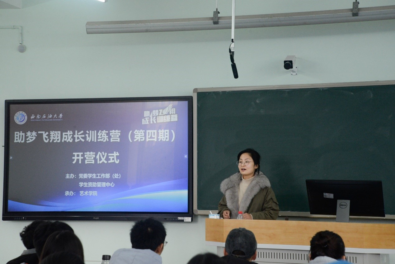 12月9日下午,西南石油大學第四期“助夢飛翔”成長訓練營開營儀式于思學樓A506順利舉行。本次訓練營主題是人際溝通與面試表達技巧,由學工部學生資助管理中心主辦、藝術學院承辦。出席儀式的嘉賓有西南石油大學藝術學院播音教研室副主任關航老師、訓練營指導員高雨蒙老師,訓練營全體學員參加開營儀式,儀式由學工部羅明輯老師主持。