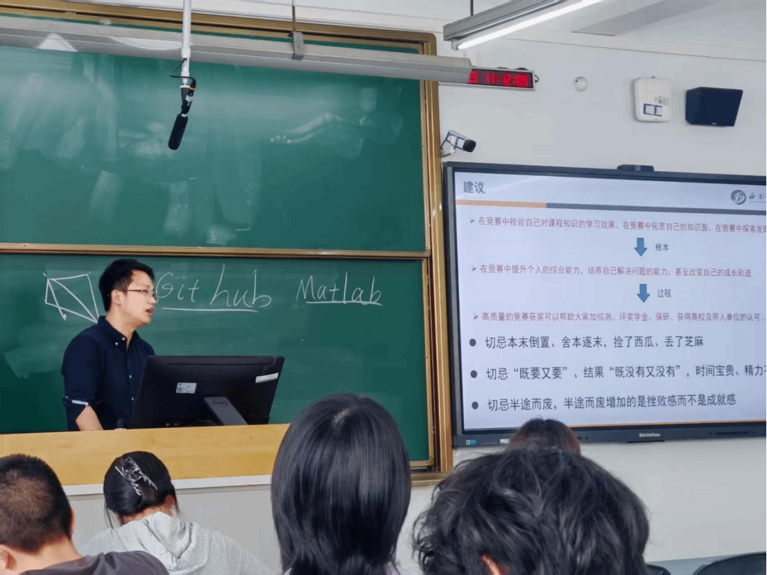 他結合自身參賽經驗,帶來了2018年參加數學建模大賽決賽作品的部分內容展示。通過這些真實的案例,同學們仿佛身臨其境,感受到了數學建模大賽的魅力與挑戰,也明白了如何運用數學知識和邏輯思維去解決實際問題,實現從理論到實踐的跨越,這正是“從解題到破題”競賽思維的生動體現。