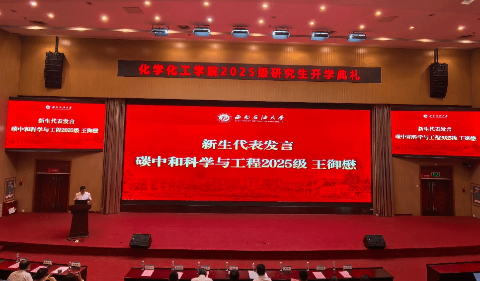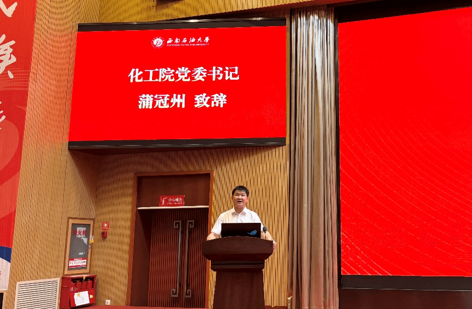 化學化工學院黨委書記蒲冠州發表致辭。他圍繞“求真、力行、開拓、創新”的院訓,對新生提出殷切期望:要恪守學術誠信,筑牢專業根基;要堅持知行合一,將論文寫在祖國大地上;要勇于探索前沿,敢于挑戰未知領域;要立志創新報國,服務國家能源戰略。他勉勵新生傳承“為祖國加油、為民族爭氣”的石大精神,在科研道路上實現人生價值。