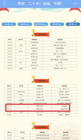 “你好,二十大!加油,中國!”系列文化藝術(shù)作品線上征集活動于2022年10月啟動,旨在迎接黨的二十大勝利召開,引領(lǐng)廣大青年學(xué)子堅定不移跟黨走,砥礪奮進、勇當先鋒、擔當使命、奮進有為,同時展現(xiàn)新時代高校青年昂揚向上的精神風(fēng)貌。活動共分為短視頻作品、書畫作品、攝影作品3個評選類別,每個類別綜合評選出10件作品獲獎。