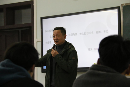 主講老師焦道利首先從影視基礎知識和認識視聽語言入手,詳細解析了景別、景深、拍攝角度和曝光率等對影視畫面的影響,并通過手機演示操作,講解了創(chuàng)意構思、劇本編寫、拍攝制作、后期剪輯等各個環(huán)節(jié)的技術要點和注意事項。焦道利指出,影視作品的策劃與制作不僅需要藝術感,更需要科學的方法和嚴謹的態(tài)度。接著,焦道利結合自身在影視作品創(chuàng)作中的豐富經驗,運用本次培訓所講內容,以案例分析的方式,深入剖析了多個影視作品,點出每一個影視作品中的拍攝技巧以及影視基礎知識的運用,讓同學們更直觀的了解并理解所講內容。