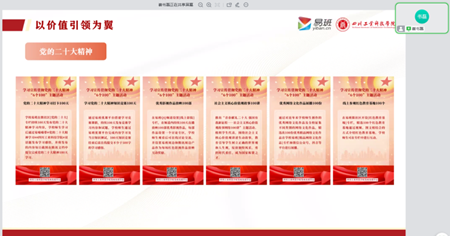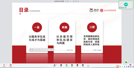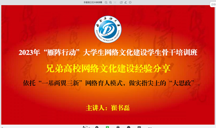 為加強(qiáng)易班平臺(tái)建設(shè),從兄弟高校學(xué)習(xí)經(jīng)驗(yàn),促進(jìn)兩校共同發(fā)展進(jìn)步。12月17日晚,“雁陣行動(dòng)”大學(xué)生網(wǎng)絡(luò)文化建設(shè)骨干培訓(xùn)班課程第七講《兄弟高校網(wǎng)絡(luò)文化建設(shè)經(jīng)驗(yàn)》通過(guò)飛書(shū)會(huì)議在線上開(kāi)展。本次課程以“依托‘一基兩翼三新’網(wǎng)絡(luò)育人模式,做實(shí)指尖上的‘大思政’”為主題,由指導(dǎo)老師李星昱主持,四川工業(yè)科技學(xué)院易班學(xué)生工作站指導(dǎo)老師崔書(shū)磊主講。