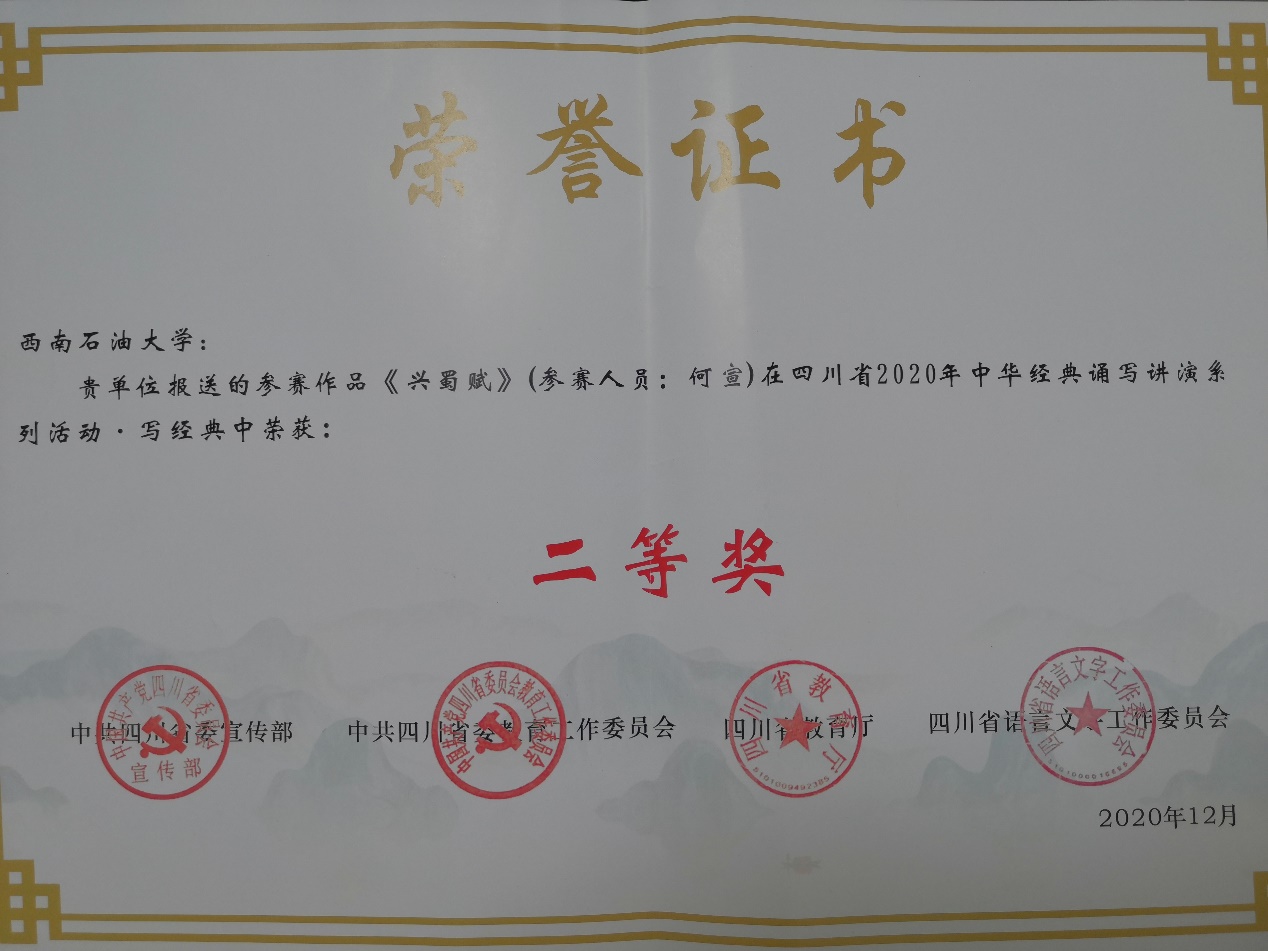 何宣創作的《興蜀賦》由地科院報送學校,榮獲校級一等獎。經學校推薦參加四川省2020年中華經典誦寫講演系列活動,斬獲二等獎。《興蜀賦》以賦文的形式,講巴蜀歷史,說巴蜀故事,議巴蜀人物,宣傳巴蜀文化,歌頌偉大復興,抒發了新時代青年治蜀興川的豪情壯志,表達了石大學子“為祖國加油,為民族爭氣”的滿腔熱情。