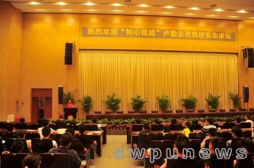 “知心姐姐”在談到誠信和責任時提到,幸福與快樂在生活中必不可少,但是你必須要有誠信和責任。什么樣的人會受歡迎,會有力量?世界上有兩種人,一種是講誠信的人,一種是講責任的人。只有當別人完全信任你的時候,這個時候你被高度信任,自然而然就有力量。隨后盧勤老師幽默生動的說了3個自己親身經(jīng)歷的故事來闡明這個觀點,她分別講述了自己在九華山出游所遇、為完成承諾而寫書以及作為兒童教育工作者在“六一”兒童節(jié)接受胡錦濤總書記接見的故事。