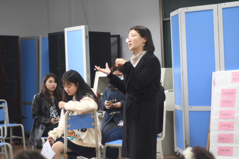隨后,翟瑋煒老師就“心理活動的設(shè)計和開展”進行了全方面的理論指導。各組心理骨干根據(jù)自己以往舉辦活動的經(jīng)驗列舉出舉辦心理活動所需要的關(guān)鍵性因素,結(jié)合各組的分享和老師的點評,將心理活動的設(shè)計和開展大致分出了以下幾個步驟“活動背景、目的意義、時間地點、活動內(nèi)容、組織分工、物資預(yù)算”。