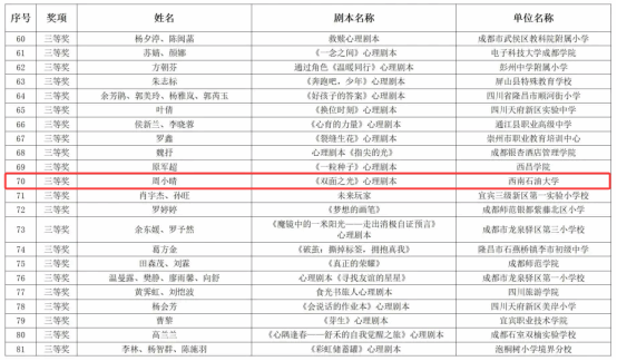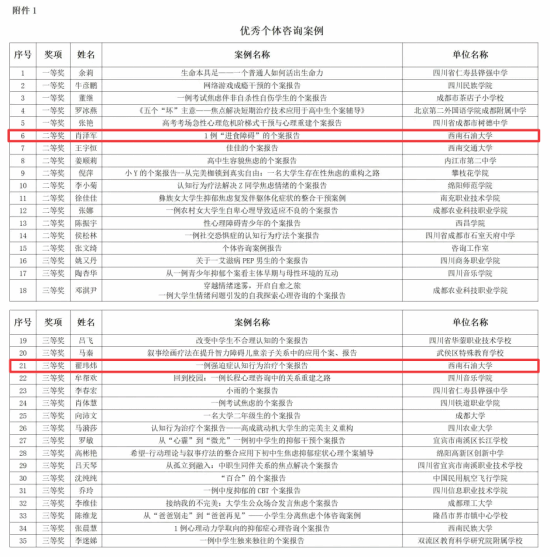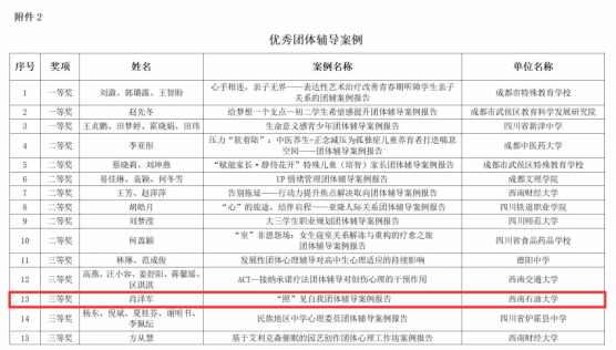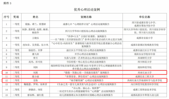 據悉,此次評選活動由四川省心理學會主辦,共收到550余份申報表。經過資格初審和評審等環節,最終評選出優秀個體咨詢案例35個、優秀團體輔導案例23個、優秀心理活動案例45個、優秀心理劇本84個。
