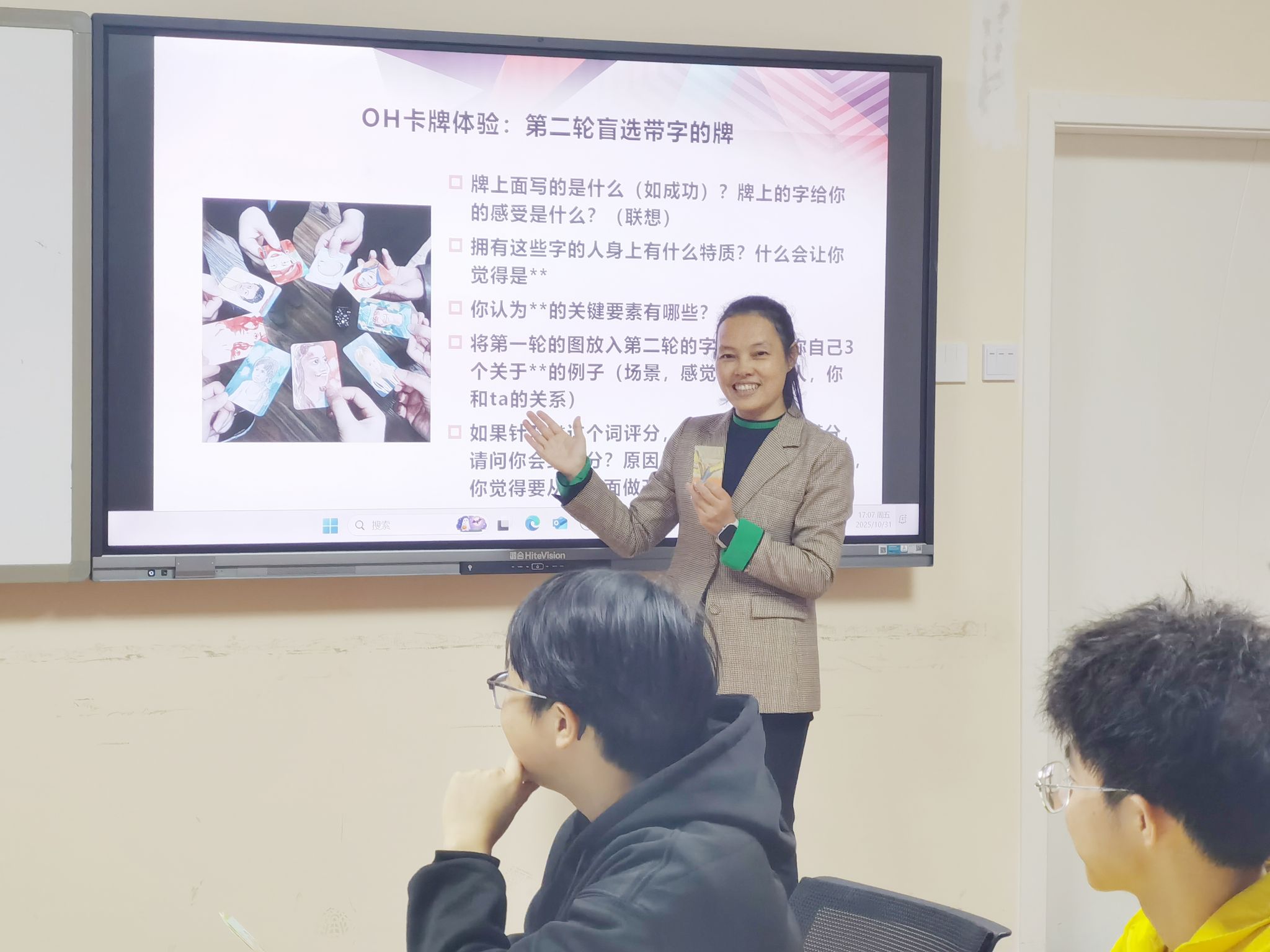 本次活動以獨特的OH卡牌為主要工具,圍繞“心靈探索”逐步展開:色彩斑斕的OH卡牌率先打破陌生感,“我是誰”卡牌自我介紹環節讓同學們在分享中開啟與內心的對話;隨后的沉浸式探索中,大家盲抽圖卡分享直覺聯想,有人看到“學術迷宮尋出口的自己”,有人喚起“成長中的溫暖瞬間”;“關系連結”環節通過提問引導挖掘卡牌與成長、生活的深層關聯,文字卡環節更讓大家收獲看待內在世界的新視角,各環節層層遞進,達到深度的心靈交流。