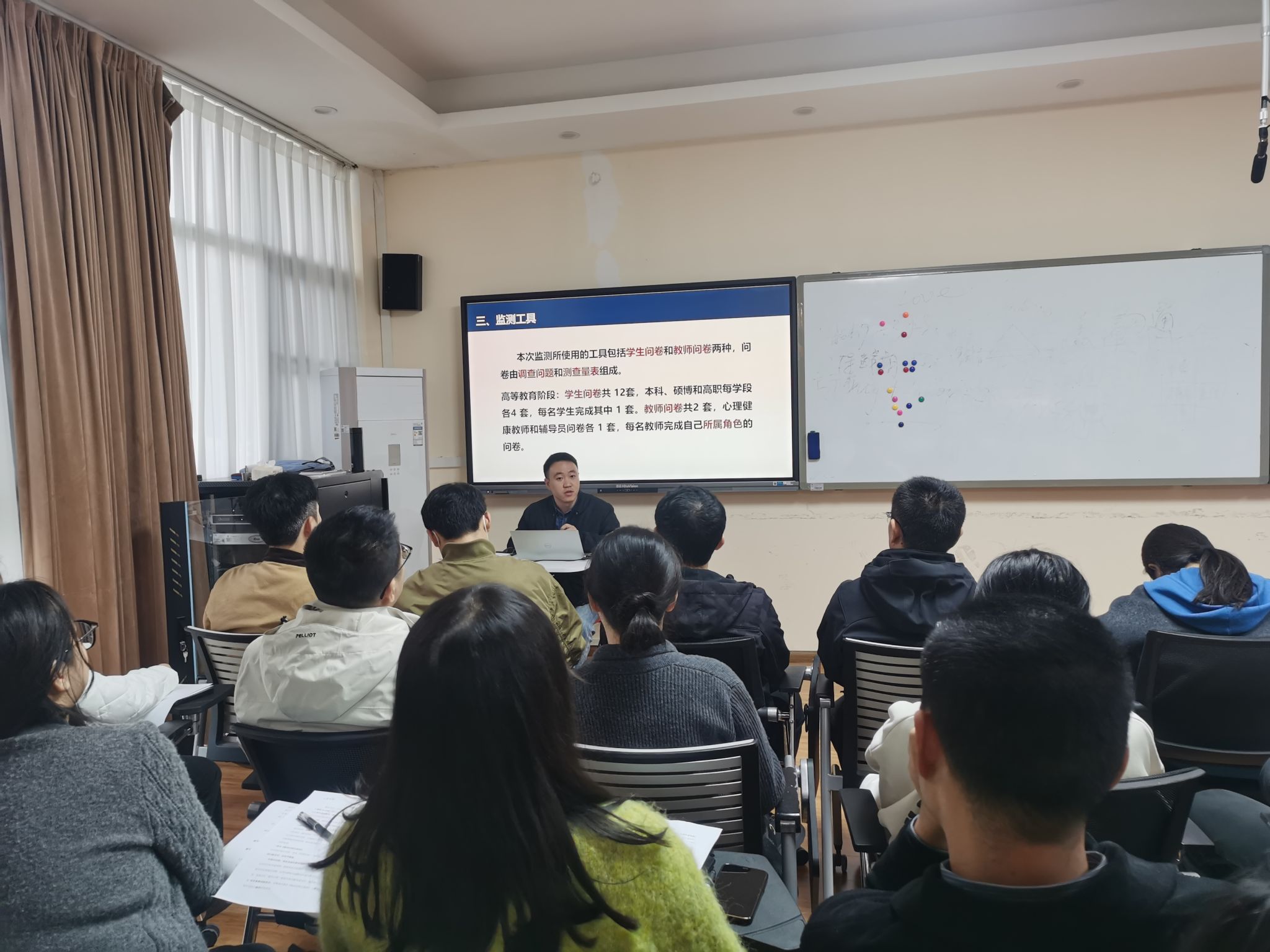 會議梳理了全國學生心理健康監測的整體概況,回顧了2024年首次全國監測工作的開展情況,并對2025年監測工作的具體流程與核心要求進行詳細說明。心理中心教師肖澤軍圍繞現場操作的標準流程展開專業講解,深入剖析了組織實施環節中的重難點與注意事項,明確了測試員們在組織學生現場測試中的主要任務,以及應對各類突發狀況的有效策略,為參會人員提供了全面且具操作性的指導。