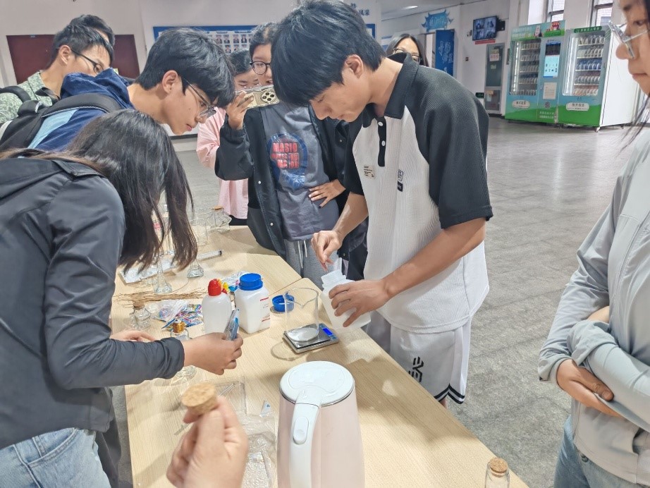 活動伊始,參與者們至實驗臺前挑選心儀的玻璃瓶——星星、愛心、燈塔等造型的器皿在燈光下折射出琉璃般的光澤。“硝酸鉀和氯化銨的混合溶液負責控制結晶速度,樟腦乙醇溶液則是天氣瓶的‘晴雨表’。”主講解員曹琰麒邊演示邊闡釋科學原理。同學們在工作人員的指導下兩兩協作,精確稱量2.5克硝酸鉀與氯化銨溶于33毫升蒸餾水,又將天然樟腦溶于40毫升乙醇,嚴謹的操作讓溶液A、B的配制效率遠超預期。當溶液B緩緩注入溶液A時,燒杯中頃刻綻放出雪花狀結晶,引得陣陣驚嘆。“水浴加熱不僅是為了溶解樟腦,更是模擬自然界溫度變化的預演。”負責安全的張怡靈提醒大家保持操作距離。隨著熱水的激蕩,