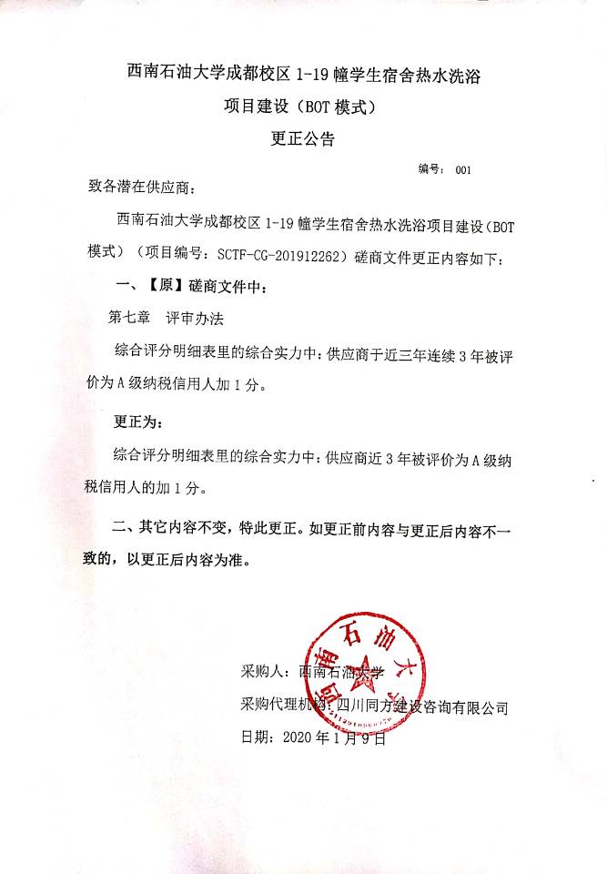 西南石油大學成都校區1-19幢學生宿舍熱水洗浴 項目建設(BOT模式)更正公告(001)